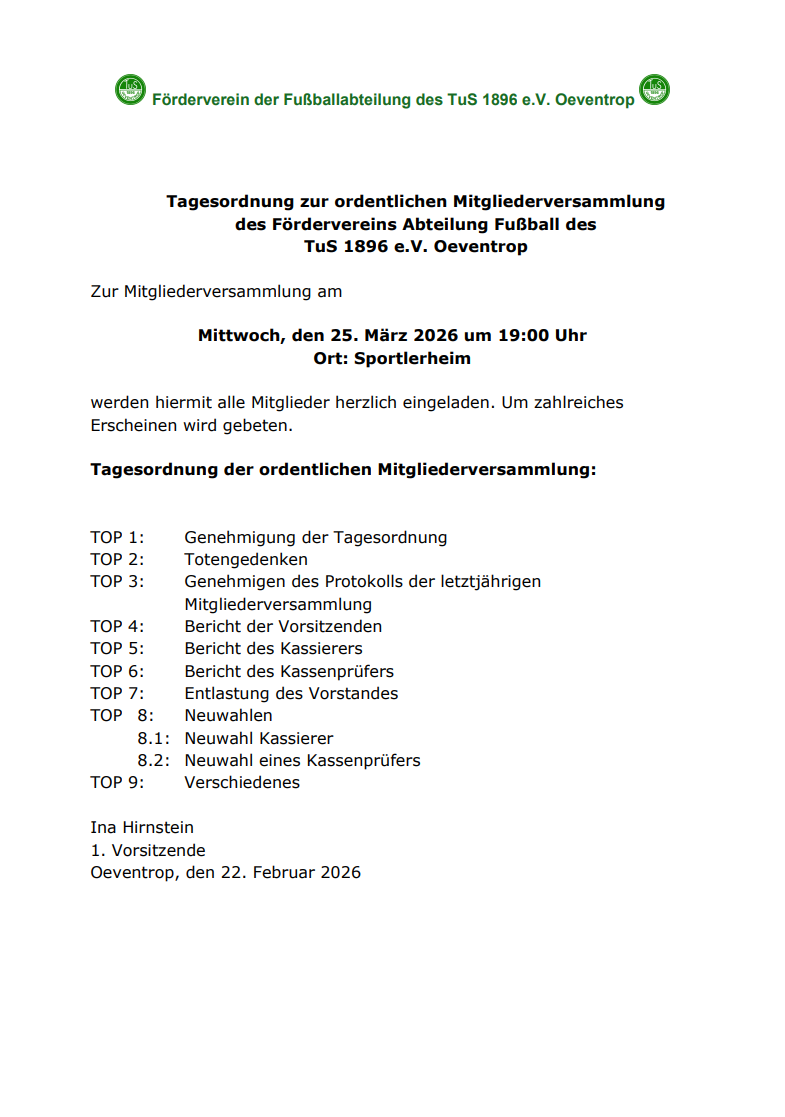 Am Freitag, den 25.03.2026, findet um 19:00 Uhr die Mitgliederversammlung des Fördervereins Abteilung Fußball des TuS 1896 e.V. Oeventrop im Sportlerheim statt. Um zahlreiches Erscheinen wird gebeten.
